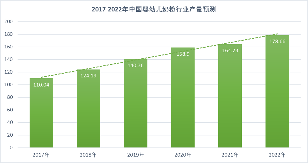 截止到2016年底,我國嬰幼兒奶粉行業(yè)產(chǎn)量是97萬(wàn)噸左右。預計到2022年,我國嬰幼兒奶粉行業(yè)產(chǎn)量將會(huì )突破170萬(wàn)噸。